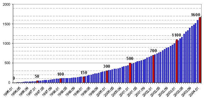 Оценить текущий объем православного интернета можно и иным способом. Известно, что наиболее крупные и посещаемые интернет-проекты используют в качестве адреса домены второго уровня в зоне .ru ( , и т.п.). Общее количество доменов в зоне .ru составляет сейчас около 280,000 (по данным на январь 2005 г.), а количество православных доменов в зоне .ru (по данным нашего каталога) - 310. Таким образом получаем, что число православных доменов второго уровня в зоне .ru составляет около 0.11% от общего их числа, что дает в точности такую же оценку.